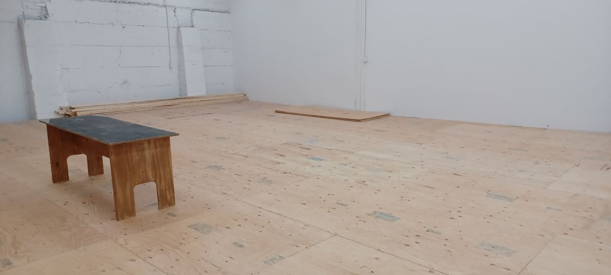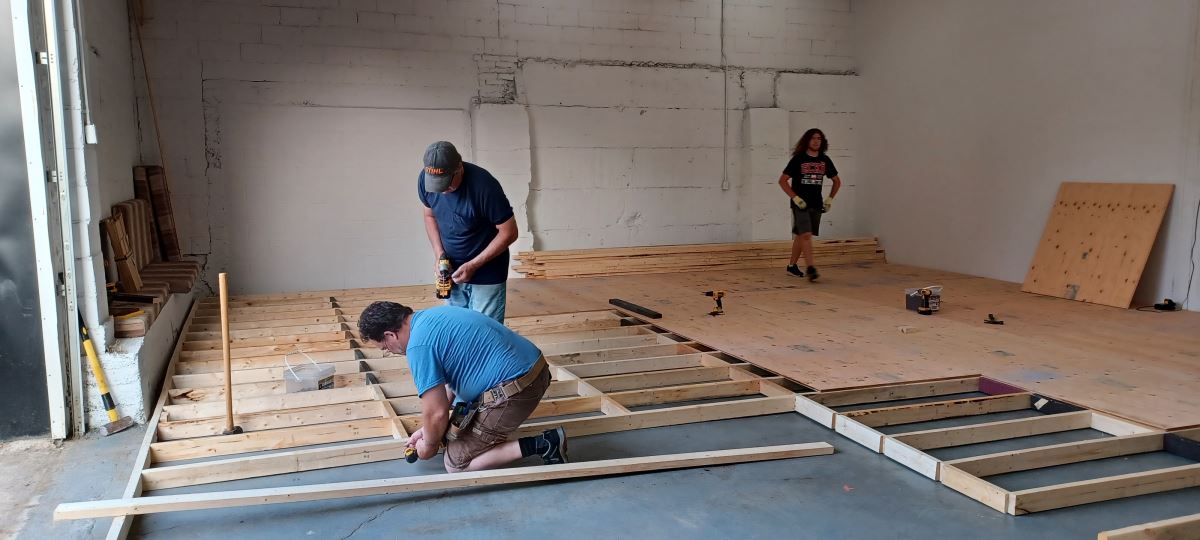 Thanks to our hardy volunteers who lifted, sweated, hammered and screwed, the rehearsal floor is completed. A bathroom to follow.